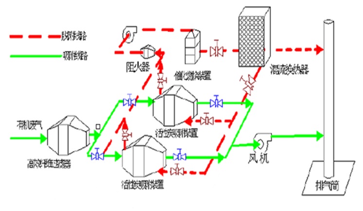 吸附脱附催化氧化净化一体化设备,利用高吸附性能的活性碳纤维、颗粒炭、蜂窝炭和耐高温高湿整体式分子筛等固体吸附材料对工业废气中的VOCs进行富集,对吸附饱和的材料进行强化脱附工艺处理,脱附出的VOCs进入效率高